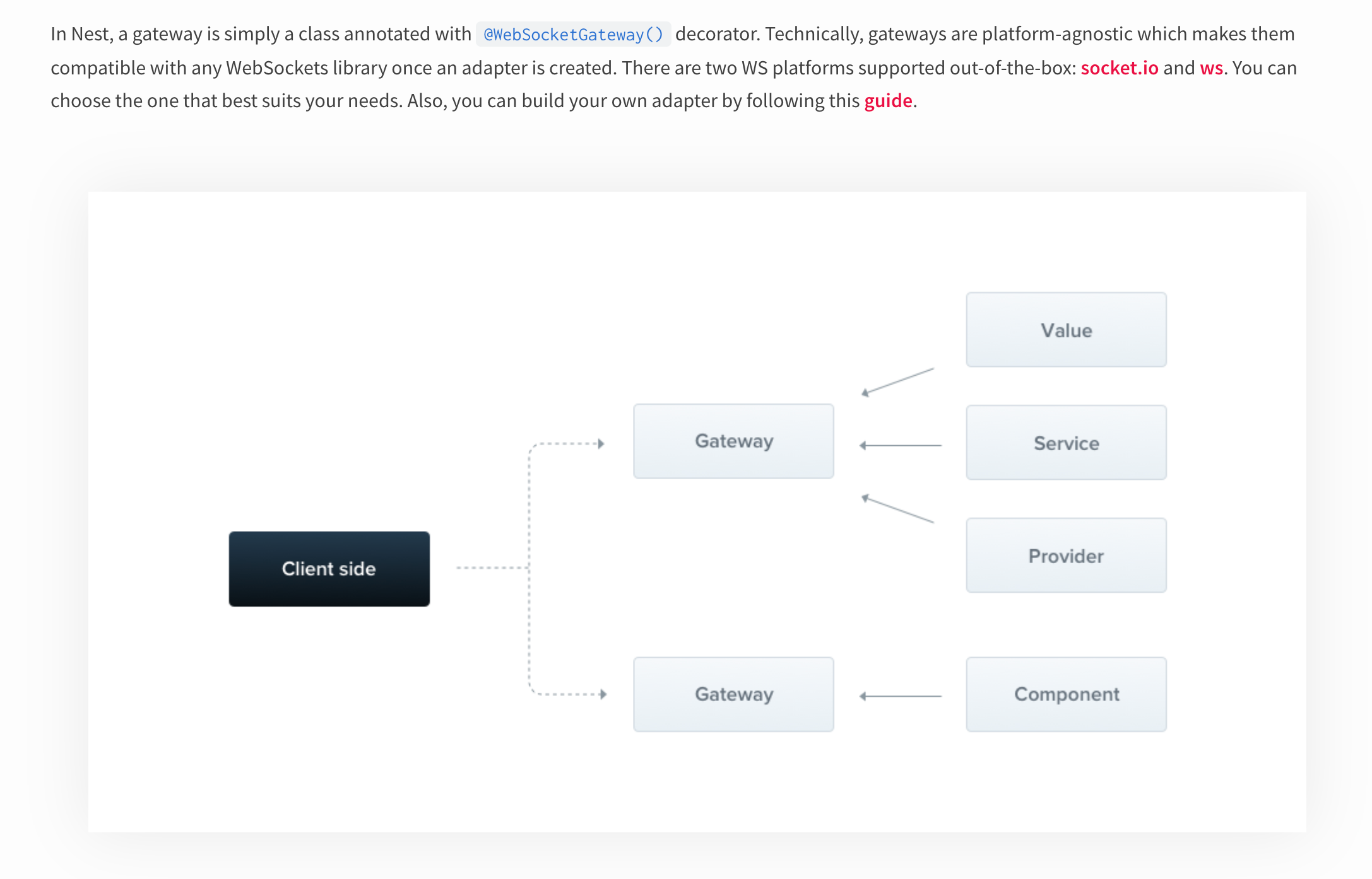 확실한것은 WebSocketGateway 라는 Decorator를 활용한 Class를 만들어 Value, Service , Provider 와 Contact 한다는것 같은데,
