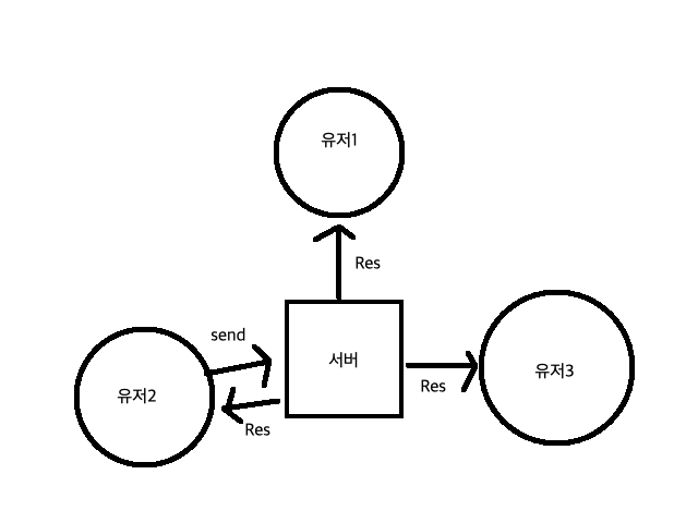 이러한 형태의 채팅을 구축하려면 유저가 처음에 접속하여 onConnect 되었을 때 해당 소켓에 대한 정보를 Array 혹은 Object 형태로 메모리에 저장해 주고, 접속해있는 어떤 유저가 메시지를 Send 했을 경우 메모리에 저장되어있는 소켓 목록들에게 한번에(일일이) send 를 해주면 된다.