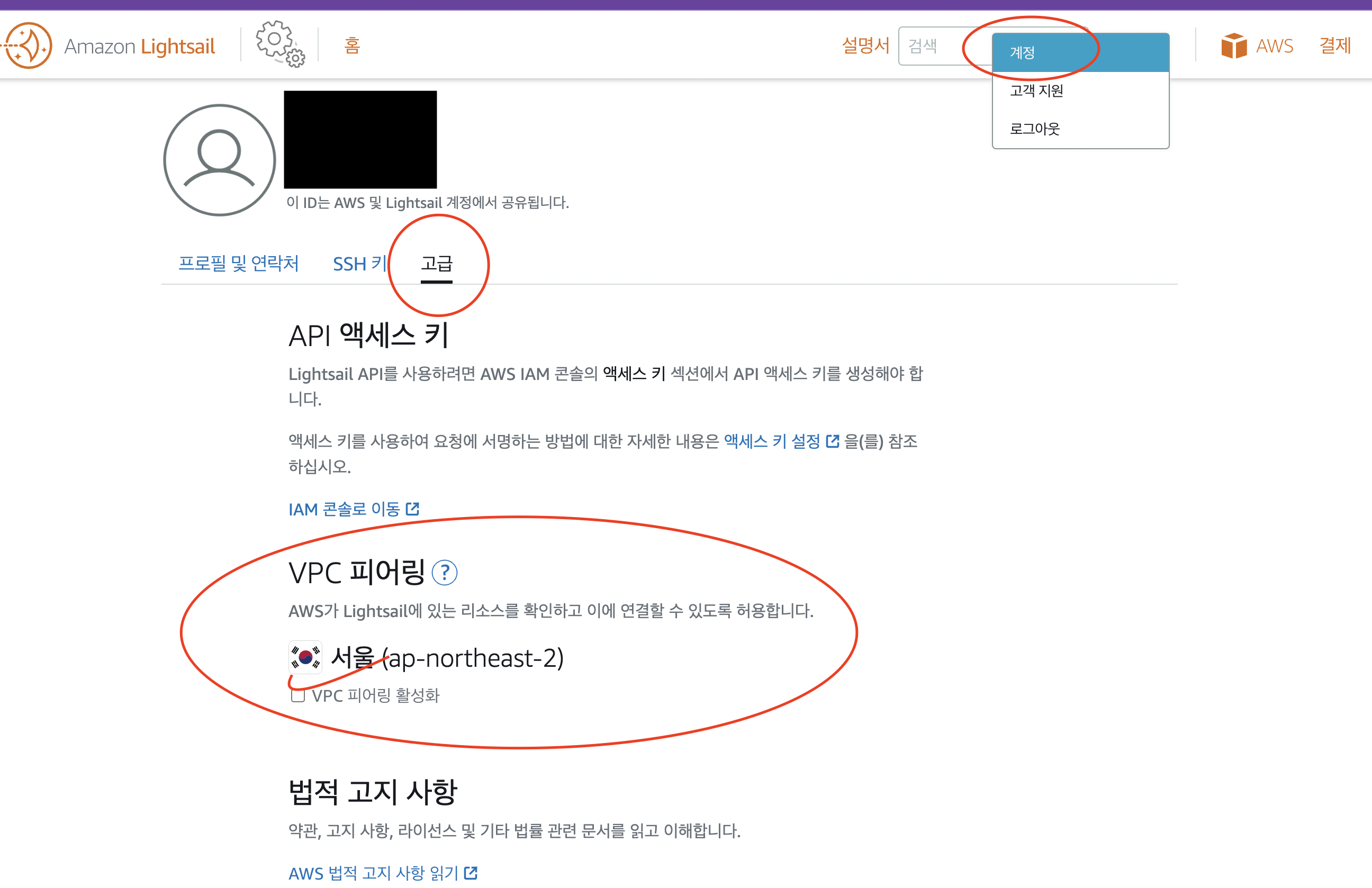 계정 > 고급 > VPC 피어링 체크