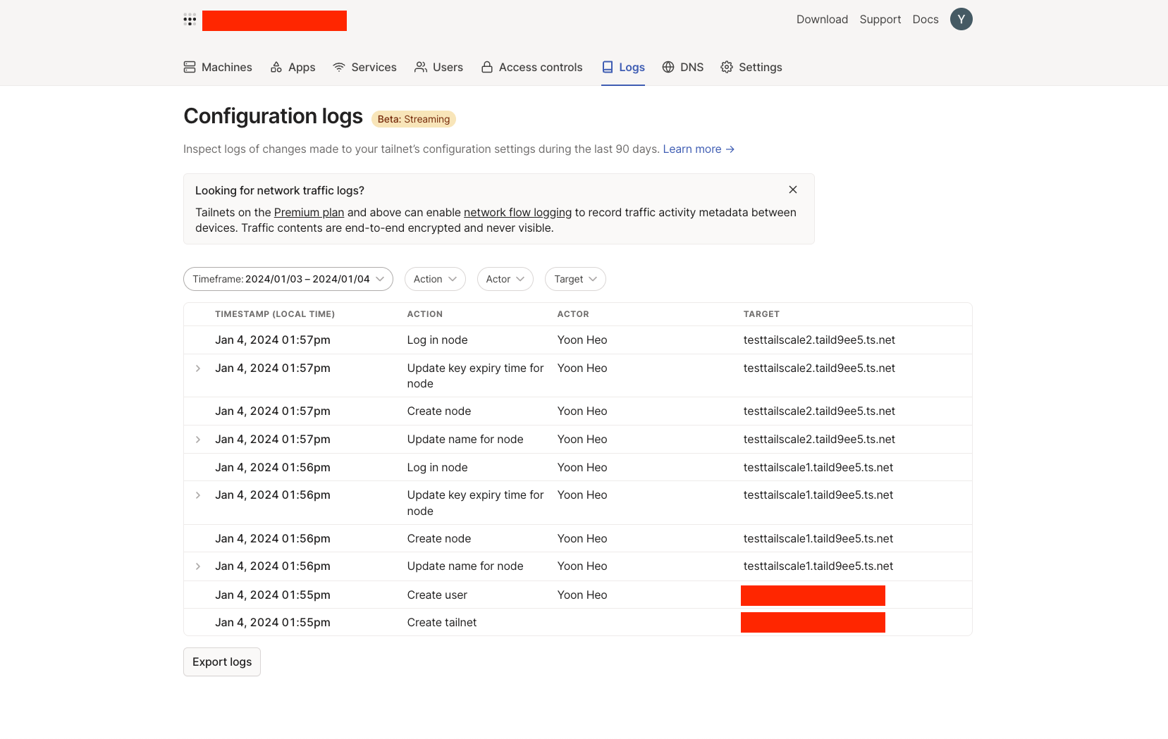아래와 같이 로그를 볼 수 있는 페이지가 있는데, 현재는 tailscale에서 발생한 설정 로그들이 이곳에 남는 것 으로 보여진다.